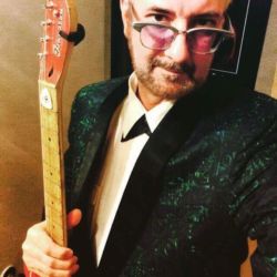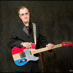 Word to musicians: do not surf eBay, Reverb or Craigslist after 3am. Your resistance to G.A.S. (Gear Acquisition Syndrome) will be low and you’ll make questionable decisions. I bought the body during such a nocturnal surfing expedition after a search for “Buck Owens guitar.” I think it was all of $65 and the odds were even that it would be a disaster. But, amazingly, it wasn’t, even though it’s glued together from 3 pieces, and the paint job is probably Liquitex acrylic. We deliberately left it rough and “unfinished,” to look like I swiped one of Buck’s barn doors and made a guitar out of it, with just a light coat of nitro to keep the paint (and splinters) from flaking off. The Buckaroos’ red/white/blue guitars had blue headstocks, but I thought red would look better. Bridge p/up is a Don Mare “White’s Lightning” stacked humbucker, second coil is engaged via push-pull on the volume pot. Neck p/up is a custom-wound rhythm that Johnston had made for me. Middle switch position wired for Esquire “cocked wah” sound. John at Johnston Custom Guitars carved this neck for me and made it into a “soft v profile,” similar to the neck on my Martin, and man does it feel great. Very light, and extremely resonant, with a “broken in” feel. This is the one I keep next to the bed. Another Johnston Custom Guitars creation, and he did a fantastic job as always.