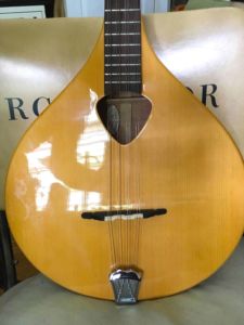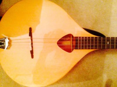 This is what’s known as an “Irish bouzouki,” and has a flat back. It likely first appeared in the late 60’s when Irish musician Dónal Lunny was given a Greek bouzouki by a friend. Being left-handed, Lunny reversed the strings and mounted them in unison, changing the character of the instrument. This modified bouzouki became fully integrated into Irish folk music when Lunny popularised it in his band, Planxty, in 1972. Also known as a cittern, it can be tuned many ways (GDAD, GDAE, ADAD, and CFAD).