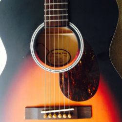 Recording King’s “Dirty Thirty” series are designed to evoke the legendary Montgomery Ward mail order guitars of the first half of the 20th century. Solid top, laminate back and sides, bone nut and saddle, satin sunburst finish, and Kluson tuners. I added a pickup, and Tusq bridge pins for more sustain. All in all a neat little 000 sized guitar. They make a number of different styles in this series.