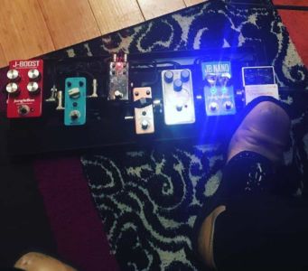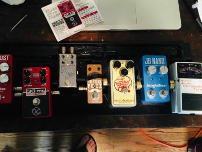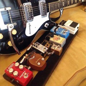 My small pedalboard/fly rig changes depending on the particular gig, but when called on for Byrds/60’s Jangle Pop related projects, this is pretty much my setup: tuner, compressor, overdrive, fuzz, delay, chorus, clean boost. I am in the market for a Keely 30ms Double Tracker, which I think will do a better job than the Mooer mini chorus.