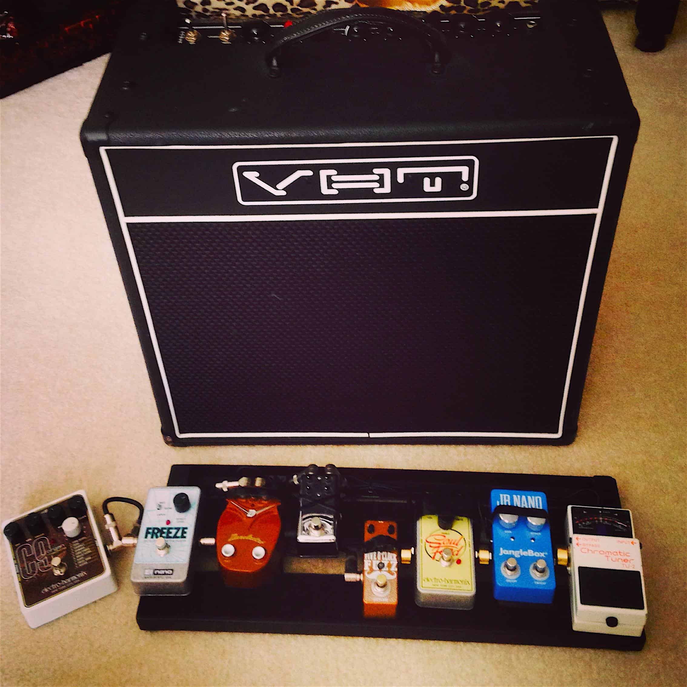The Music Link makes VHT Amps, and they sent me this nifty combo to use on the road. It’s handwired and mod-friendly, has a Volt Switch on the underside of chassis so you can choose 12 or 20 watts, and a really gorgeous sounding 12AX7-powered spring reverb and deep vibrato. The amp ships with 6V6 power tubes, but it’s designed to accept adapters that reconfigure the output tube sockets to accept EL84’s if you want a more British flavour. Basically its something of a Princeton Reverb/Deluxe Reverb hybrid with the flexibility to generate VOX-like tones via the EL34/84 option.