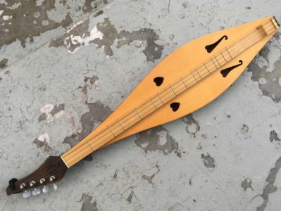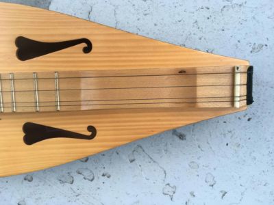 Its strung in three courses: two single-strung; one double-strung, with the doubled course being the highest-pitched (melody) course, and is played exclusively in the diatonic scale. You can fret with your fingers, or use a wooden dowel, which gives it more of a “zingy” zither-like sound. The frets are arranged in a diatonic scale, in contrast to instruments like the guitar or banjo, which are fretted chromatically. Usually six frets, this one has an additional fret, usually the so-called “six and a half,” “6½” or “6+” fret a half step below the octave. This enables one to play in the Ionian mode when tuned to D3-A3-D4 (the traditional tuning for the Mixolydian or “mountain modal” mode), where the scale starts on the open (unfretted) string. This arrangement is often found to be more conducive to chord-melody play. Its also common to add a fret one octave up from the 6+ fret, called the “13+” fret, on more expensive instruments.