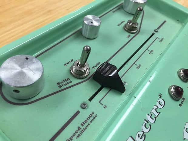 Who doesn’t love an amp with beautiful, deep, hypnotic, built-in tremolo? My Vibrolux Reverb supplied that and then some for ages until my urban apartment living years when I had to stick it in the closet and get used to a much smaller amp that lacked reverb and trem, which meant I had to use pedals for those effects. Dano’s “diner” series — which in the late 90’s could be had for, like, $25 — scrimped on the case, pots and switches, but splurged on tone. Knobs for Speed, Depth, and…wait for it…a switch for selecting between Hard and Soft tremolo. Its got an extremely juicy and organic “soft” setting, somewhere between a ’60’s Fender amp and Hammond console vibrato. On the “hard” setting you can dial in a super fast square-wave, i.e., The Electric Prunes’ “I Had Too Much To Dream Last Night”…yes, this is the second time I’ve mentioned that song here. Yes, the housings are plastic (there’s apparently a whole cottage industry for rehousing them). It’s not “true bypass.” The little fiddly knobs can get lost (see mine…anyone know where I can get replacements?). But for my money this is the closest trem for under a couple of C-notes that I’ve found that apes the storied “harmonic tremolo” used in early 60’s Fender amps before they replaced them in the blackface-era with a photocell circuit. Sadly Dano no longer seems to be making pedals, a shame because they were the millennial-era’s go-to for quite a while, and produced some wild, wooly and wacky offerings. I still wish I’d gotten a Dano “Back Talk” reverse delay back in the day…check out what they go for on the used market these days…holy crap!