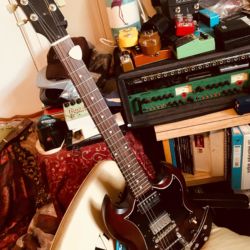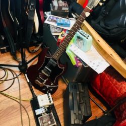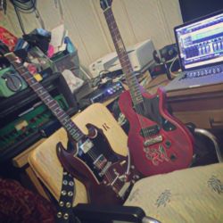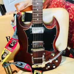 So far I’ve recorded with it on a handful of sessions, and its been a solid player, with a 24.75” scale length, worn-looking nitrocellulose satin finish, and a glued-in 22 fret 12” radius set neck made from quarter sawn mahogany with an unbound rosewood fingerboard. It has an angled headstock with a rounded ’50’s profile, so it doesn’t get rubbery and shift around like some of the thinner-necked SG’s. I left it pretty much stock, including the Corian nut, and Gibson’s “Modern Classics” humbuckers (similar to PAF’s but with AlNiCo II magnets and a bit more output), but with added pickup covers because I hate the open coil look. I also added a GFS X-Trem vibrato with a somewhat stiffer spring. Loaded with D’Addario NYXL .10-.46, it is indeed a Rawk Hoss. Unfortunately out of production, because…well, because Gibson. Insert eye-roll here.